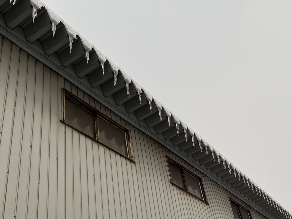 工場の屋根から長いつららがたくさん😲❄️